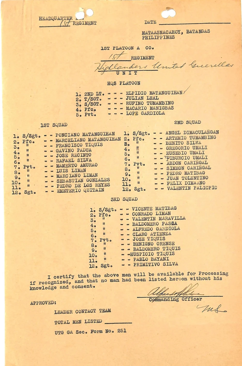 The Highland United Guerrillas was guerrilla outfit that operated in the Province of Batangas out of the Municipality of Mataasnakahoy in World War II. It was under the command of one Alfredo Silva. In this page is contained the roster1 submitted by this guerrilla unit in its application for official recognition by the United States Army.