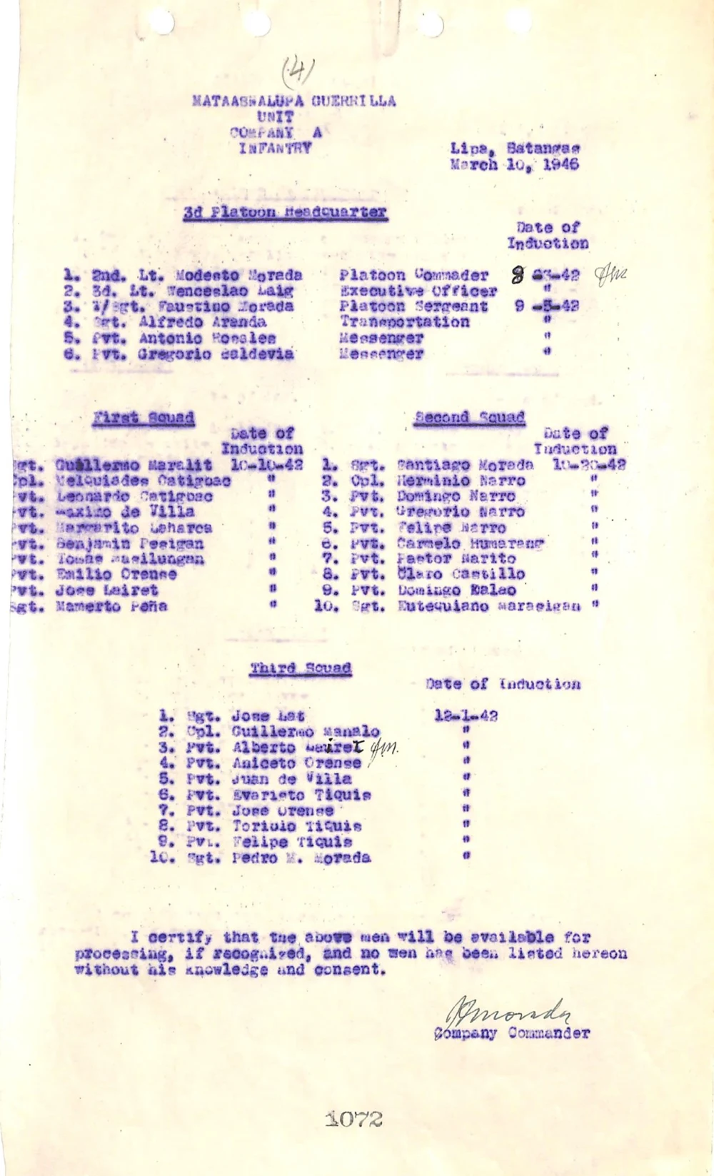 The Mataasnalupa Guerrilla Unit was supposedly a small guerrilla outfit operating in the then-municipality of Lipa during the Japanese Occupation of Batangas up to the liberation of the province. It was commanded by one Julian Morada. This unit failed to obtain official recognition as an element of the Philippine Army in the service of the Armed Forces of the United States. In this document1 is contained the roster of this guerrilla unit, preceded by the cover letter.